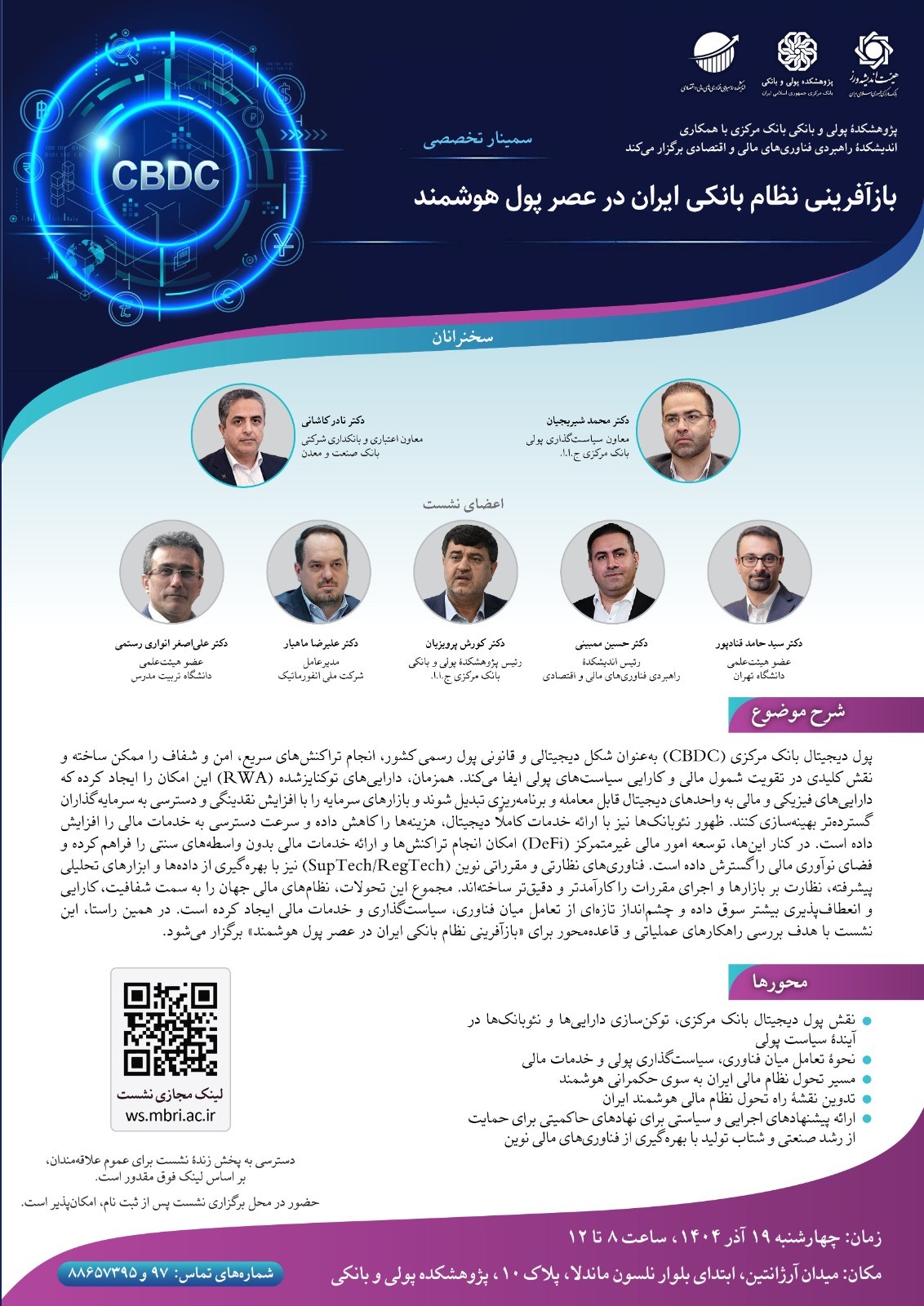 سمينار تخصصي «بازآفريني نظام بانکي ايران در عصر پول هوشمند» با حضور صاحبنظران اقتصادي و کارشناسان ارشد پولي و بانکي روز چهارشنبه 19 آذر ۱۴۰۴ در پژوهشکده پولي و بانکي بانک مرکزي برگزار مي‌شود.